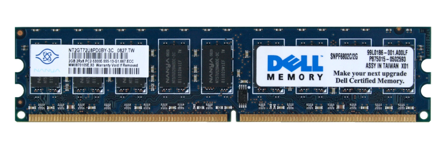 - 2GB memory upgrade kit dedicated for DELL PowerEdge & Precision Workstation consisting of 1x 2GB PC2-5300 DDR2 667MHz ECC UNBUFFERED DIMM | SNPF6802C/2G. ESUS IT gives you a guarantee that the offered product is original.