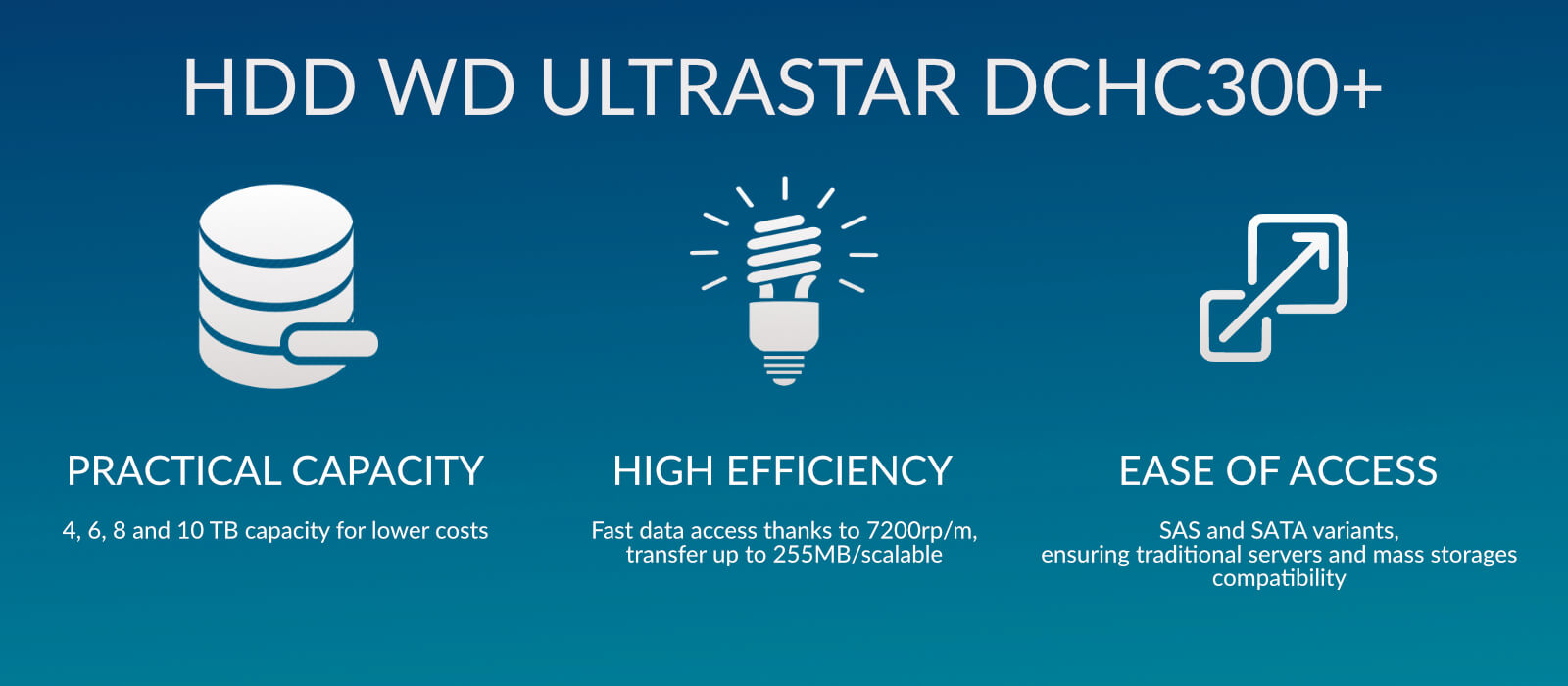 Designed for those most demanding when it comes to data storage. Cost efficiency combined with fast and reliable access - Ultrastar DC HC300 uses tried and trusted air-filled design, providing 4 to 10 TB of storage to meet data centers workload demands, as well as staying within competitive pricing range. Perfect for mass storages and servers, as well as distributed and scalable systems. 7200rp/m ensures speed that remains budget-friendly.