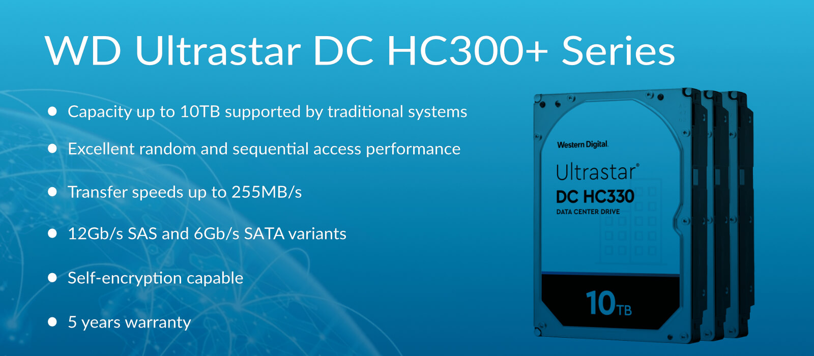 Ultrastar DC HC310, HC320 and HC330 HDDs showcase improved air-based build, which uses conventional magnetic recording (CRM) encased within large 3,5" large format. Using just slightly larger media, they provide about 12% performance increase when compared to previous generation. Equipped with two-step micro-actuator, which increases positioning precision of the motor, as well as Western Digital media cache architecture to impreve reliability and integrity of data in case of unexpected power failure. Finally, adding flash-based non-volatile cache i both SATA and SAS variants further improves write performance.