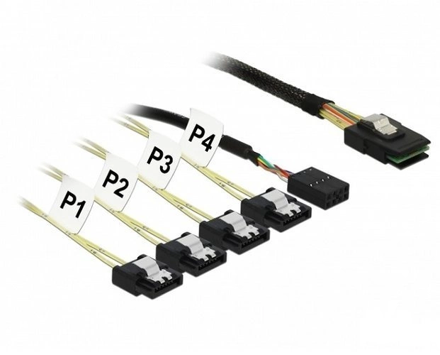 - Delock Cable (83319) Mini SAS SFF-8087 | 4 x SATA 7 pin Reverse + Sideband 1m. | 83319