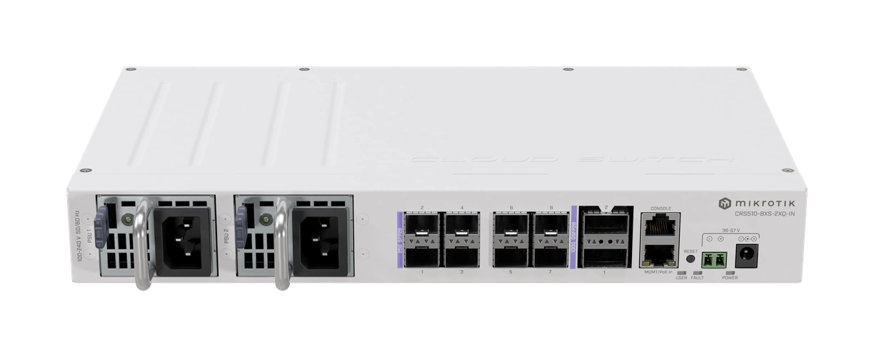 - Switch Mikrotik CRS510-8XS-2XQ-IN 1x 10/100/1000 8x SFP28 2x QSFP28 (DC jack, PoE-IN, 2-pin terminal)
